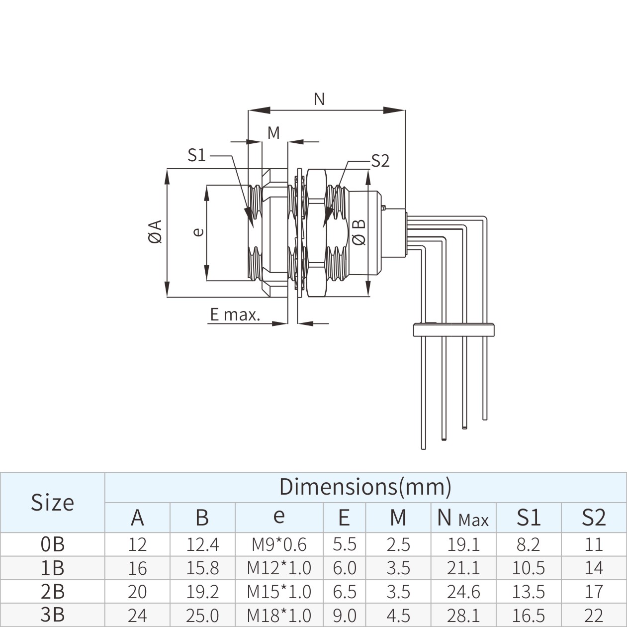 | 0B | 12 | 12.4 | M9*0.6 | 2.4 | 2.5 | 18.3 | 8.2 | 11 |