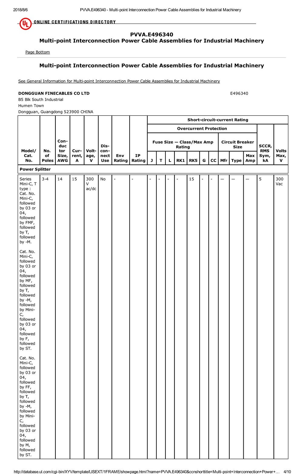 Please refer to UL Certificate link: http://database.ul.com/cgi-bin/XYV/template/LISEXT/1FRAME/showpage.html?name=PVVA.E496340&ccnshorttitle=Multi-point+Interconnection+Power+Cable+Assemblies+for+Industrial+Machinery&objid=1087896138&cfgid=1073741824&version=versionless&parent_id=1077991988&sequence=1