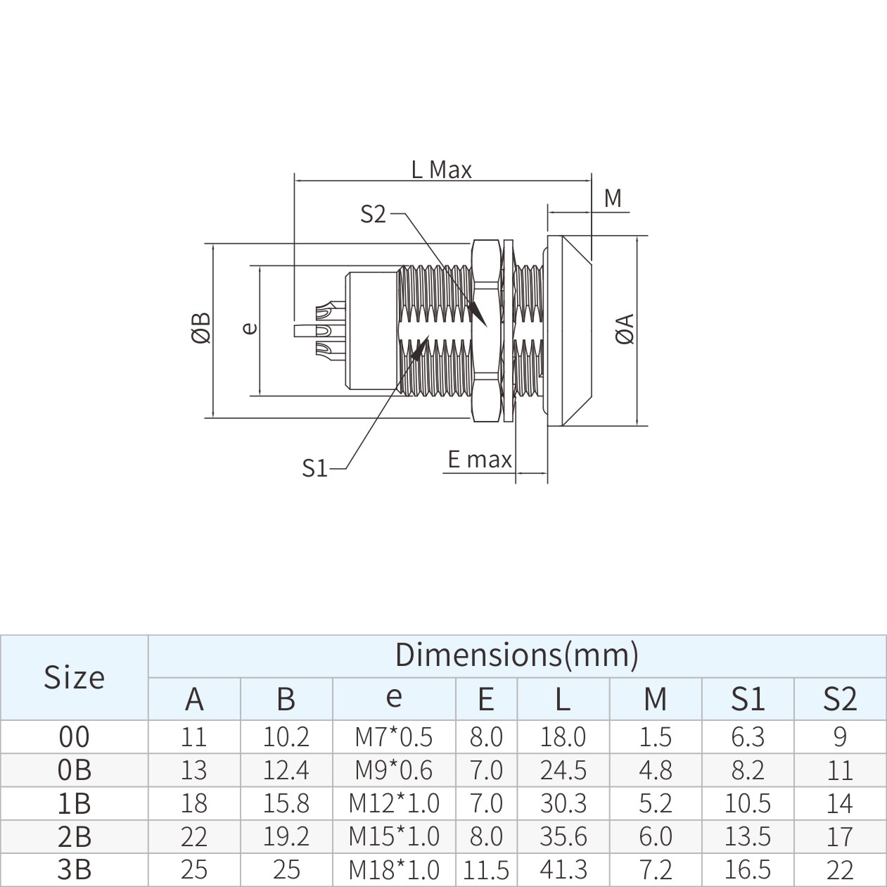 | 1B | 18 | 15.8 | M12*1.0 | 7.0 | 30.3 | 5.2 | 11.0 | 10.5 | 14 |