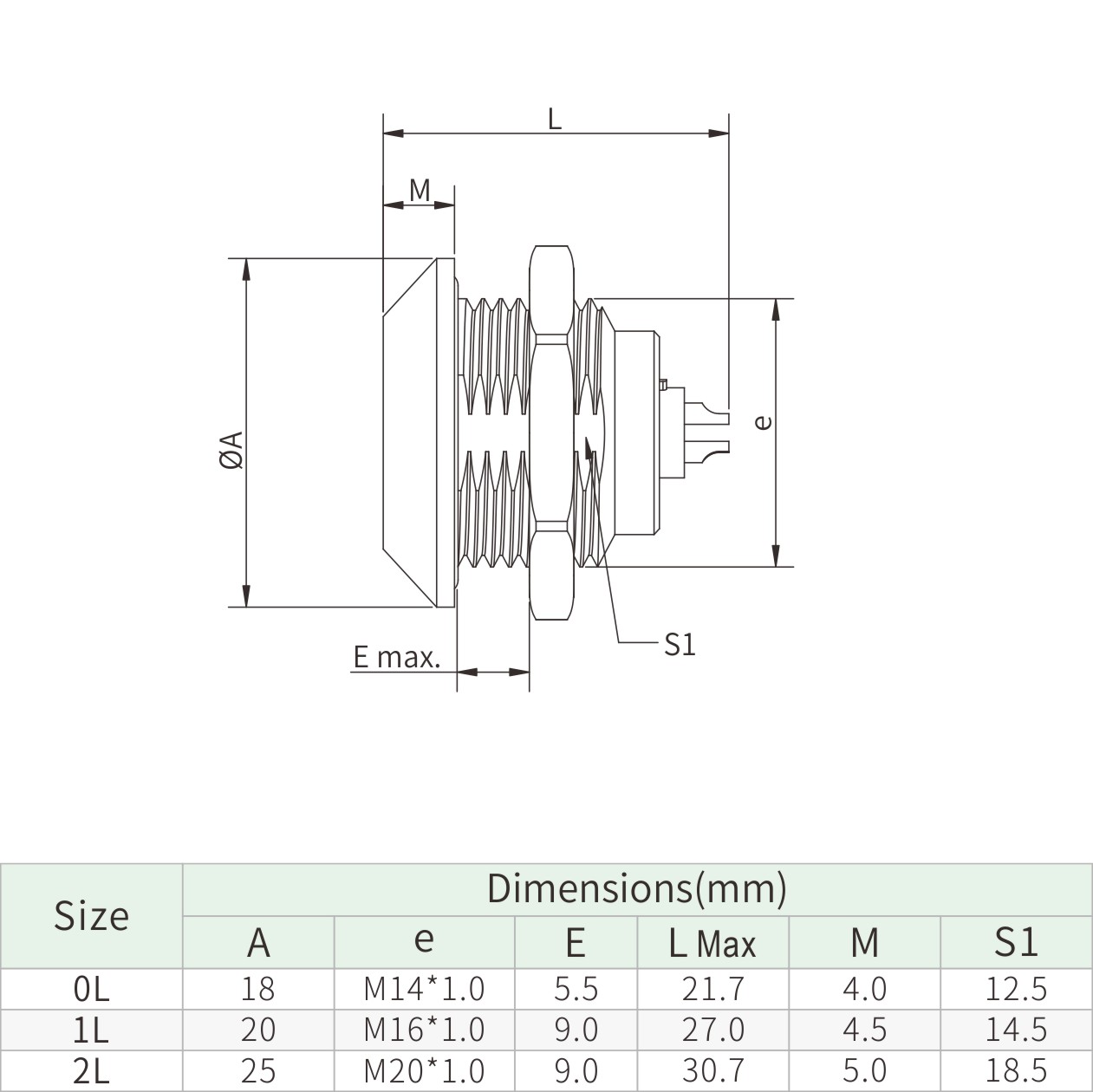 | 0L | 18 | M14*1.0 | 5.5 | 21.7 | 4 | 12.5 |