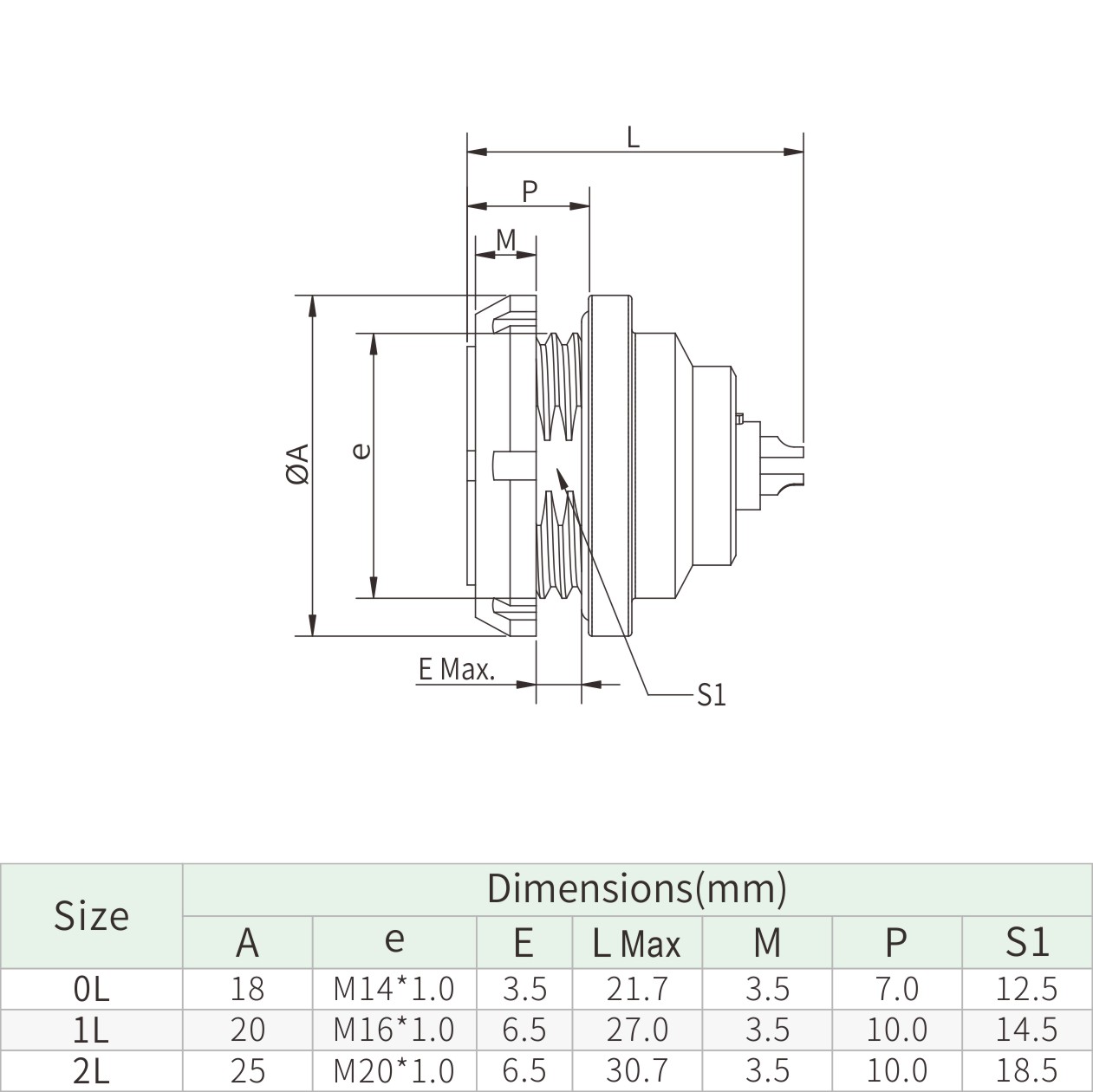 | 0L | 18 | M14*1.0 | 5.5 | 21.7 | 3.5 | 7 | 12.5 |