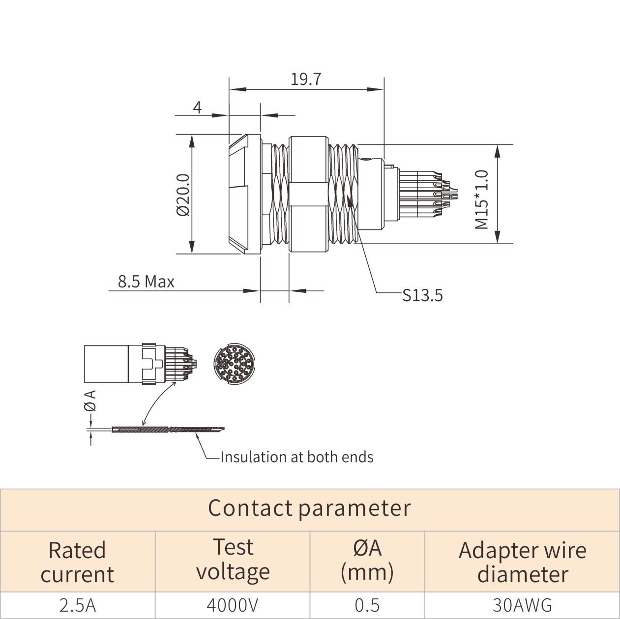| Rated Current | Test Voltage | φA (mm) | Adapter Wire Diameter |